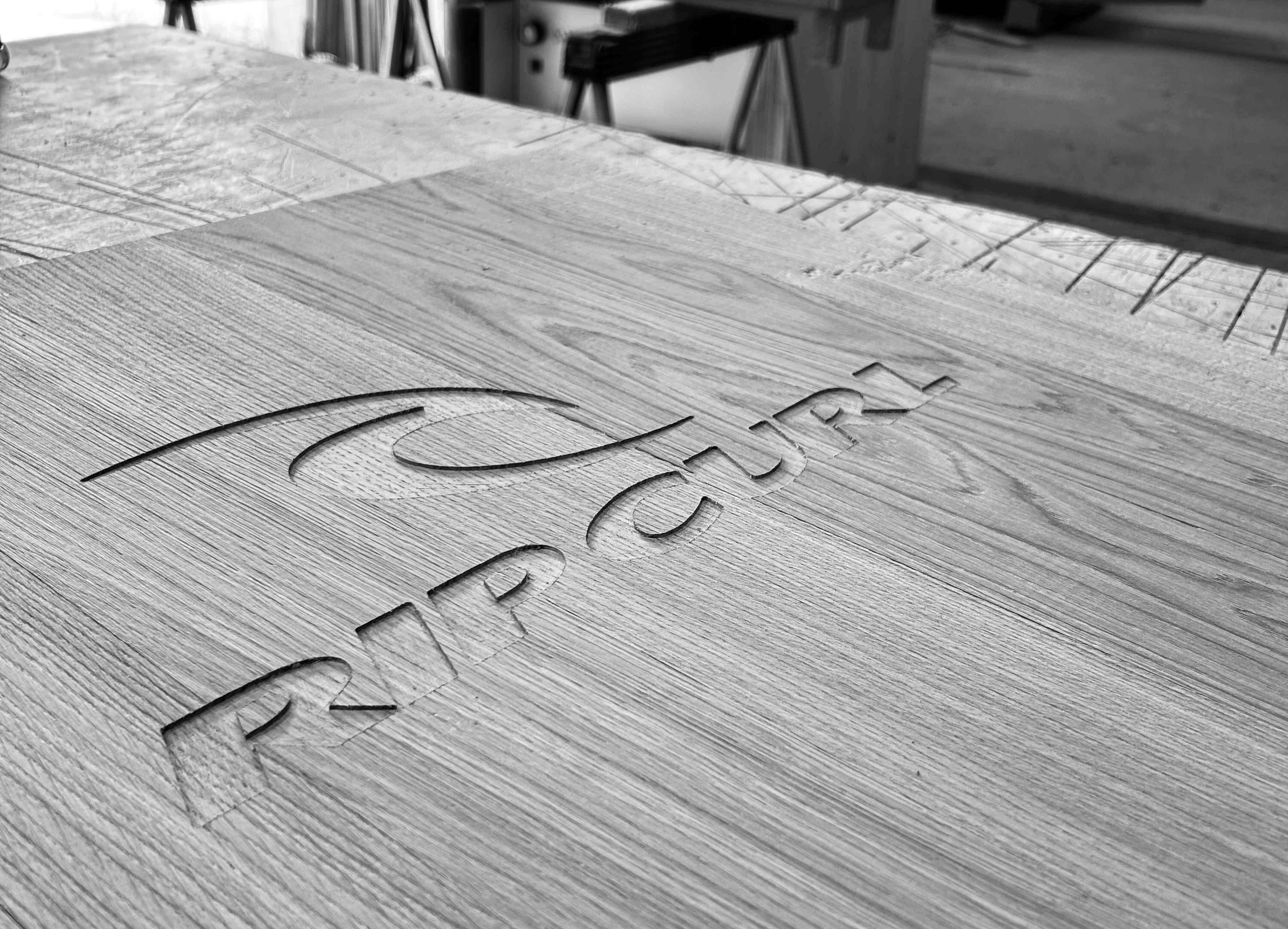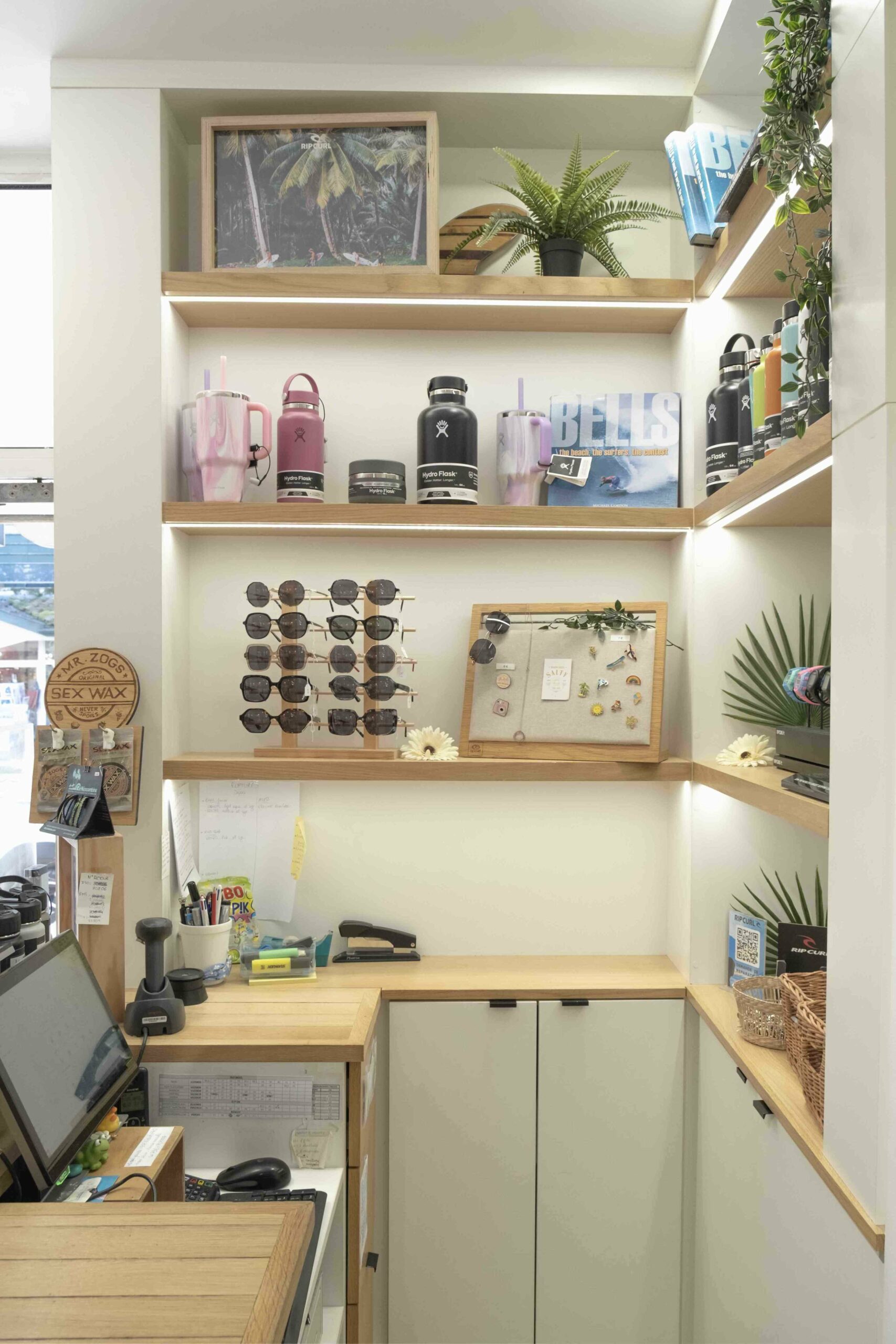 Meuble de caisse et rangements sur mesure pour Rip Curl Europe, conçu en mélaminé blanc et chêne massif brossé.